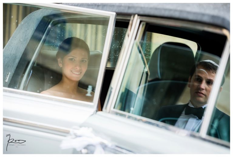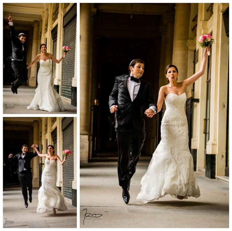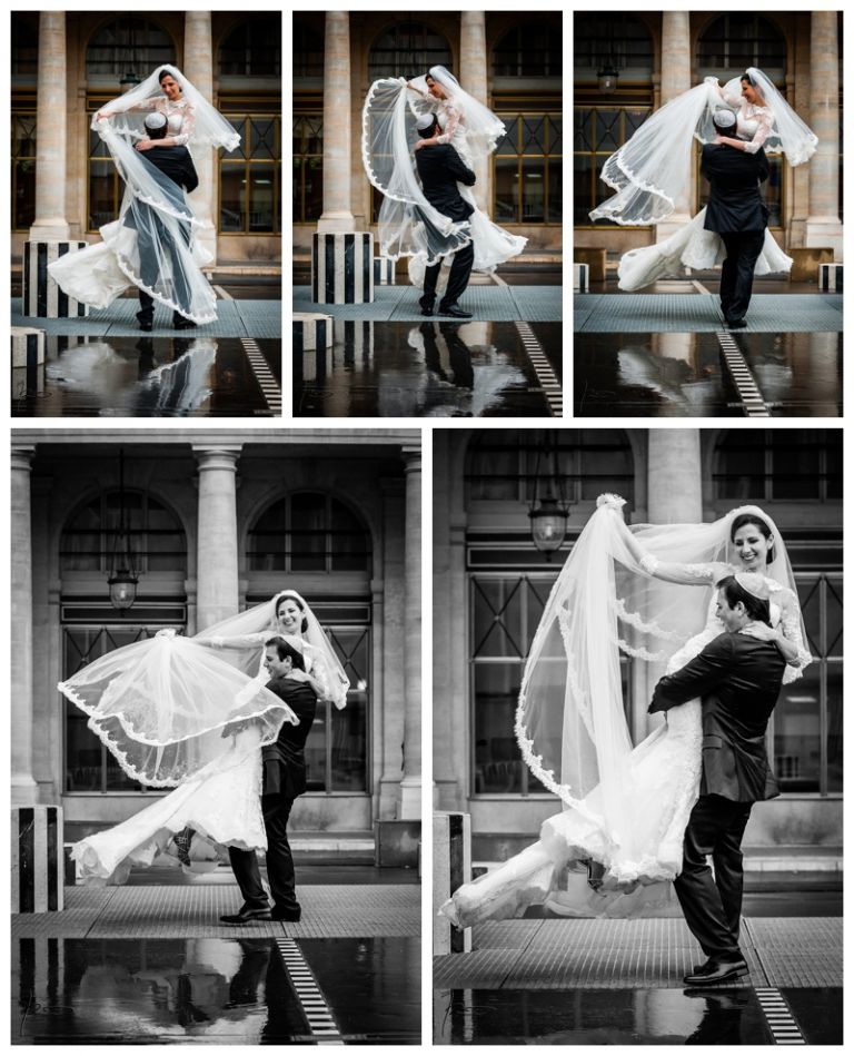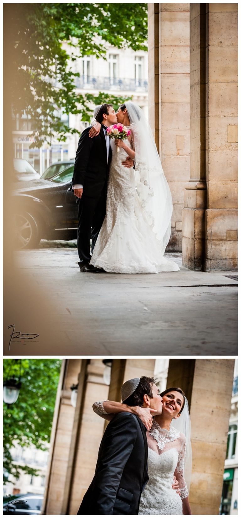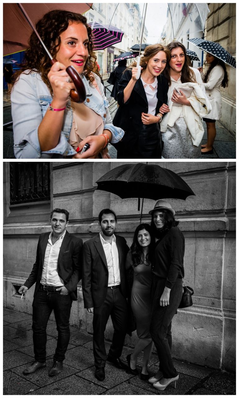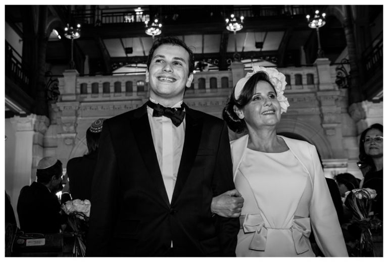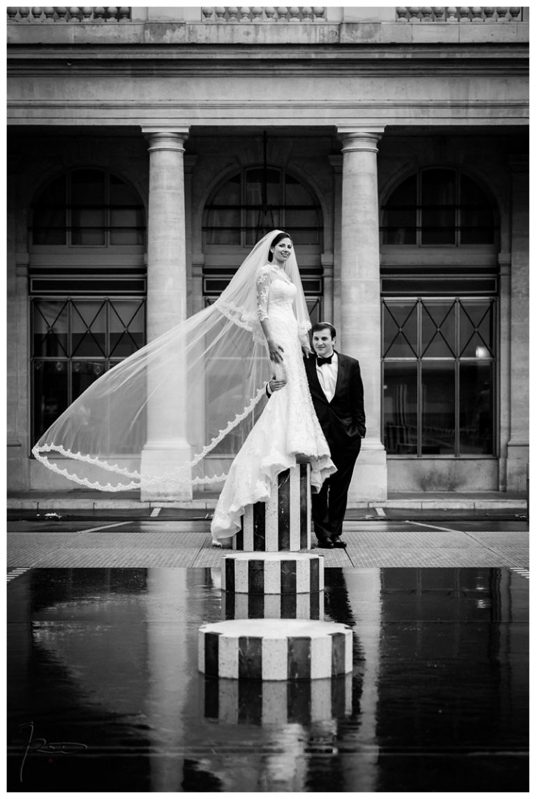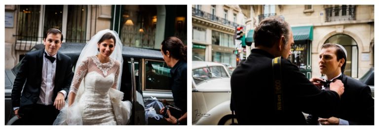 Nous avions déjà réalisé plusieurs séances photos de couple avec Barbara & Raphaël avant le jour de leur Mariage Juif religieux à la synagogue des Tournelles à Paris C’est par une séance engagement dans le quartier Juif de Paris que nous avions plus précisément pu définir les différents style photo de mariage vintage, rétro, moderne ou photo journaliste que mon couple amoureux souhaitait comme souvenirs pour leur mariage Juif – Leur mariage civil Juif à la mairie de Levallois-Perret quelques jours avant, suivi de la Soirée Henné Juif le même jour avait été un grand moment de joie pour les deux familles – Un deuxième photographe de mariage, Laurent avait suivi la préparation du marié pendant que je m’occupais de la préparation de la mariée et de toutes les filles présentes. Nous nous sommes retrouvés devant la Synagogue des Tournelles, les familles et tous les invités arrivent dans la bonne humeur et attendent avec impatience les futurs mariés sous la pluie !! Faire des photos de mariage sous la pluie est pénible, très pénible. La moindre goutte sur l’objectif est à essuyer de suite pour ne pas rater le cliché. Mes appareils sont tropicalisés ce qui veut dire que leurs joints sont de bonne qualité mais ils ne sont pas étanches non plus !! Nous ne faisons pas de la photographie de mariage sous marine !! Et c’est toujours angoissant de voir son appareil photo trempé, de peur qu’il ne fonctionne plus, même si pour ma part j’ai deux autres boîtiers disponibles immédiatement en cas de problème. Raphaël arrive sous la pluie, tout comme Barbara et nous sommes peu à y assister, les autres étant à l’abri à l’intérieur de la Synagogue des Tournelles. La bénédiction du Papa dans la salle d’à côté et Raphaël fait son entrée dans la grande allée accompagnée de sa maman sous les applaudissements jusque sous la Houpa, très ému. Barbara, prend place au début de la longue allée, la musique démarre, elle aussi très émue n’ose pas encore regarder au loin son futur époux, voulant ne pas fondre en larmes par trop d’émotion. Papa offre son bras, Barbara s’y accroche et à leur tour font leurs entrées, Laurent réalisera des coursives du premier étage de très belles images de ce défilé. L’émotion est toujours à son paroxysme quand le couple d’amoureux se retrouvent sous la Houpa. Le Rabbin, ( dont je ne connais pas le nom ), toujours le même, est d’une extrême sympathie pour tous les couples d’amoureux qui se présentent à lui. Ses cérémonies sont toujours très émouvantes, riches d’enseignements et toujours placées sous le signe de la bonne humeur et du rire. Ce n’est pas un homme austère, bien au contraire !! Entres rires, larmes et recueillements, la cérémonie de ce mariage Juif est ponctué par les Shebra Brahot, Barbara refermera son index sur l’alliance que lui présente Raphaël, ketouba signée et offerte à Barbara, bénédictions du Rabbin et verre brisé achèveront ce très émouvant mariage Juif à la Synagogue des Tournelles. Quelques photo de couple à Palais Royal, où nous attendons notre tour car d’autres photographes de mariage y étaient avant nous. Nous n’y restons pas longtemps, le soleil étant absent de ce rendez vous, nous décidons de nous retrouver à Enghien les bains, lieu du cocktail et de la Simha dans l’espoir de continuer cette séance de photos de couple si le temps le permettait.