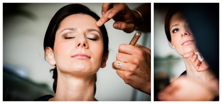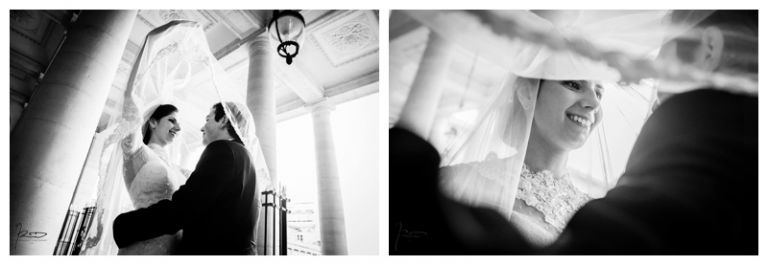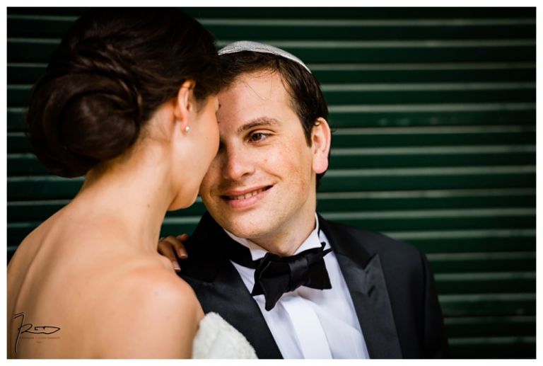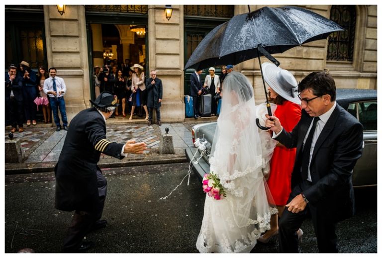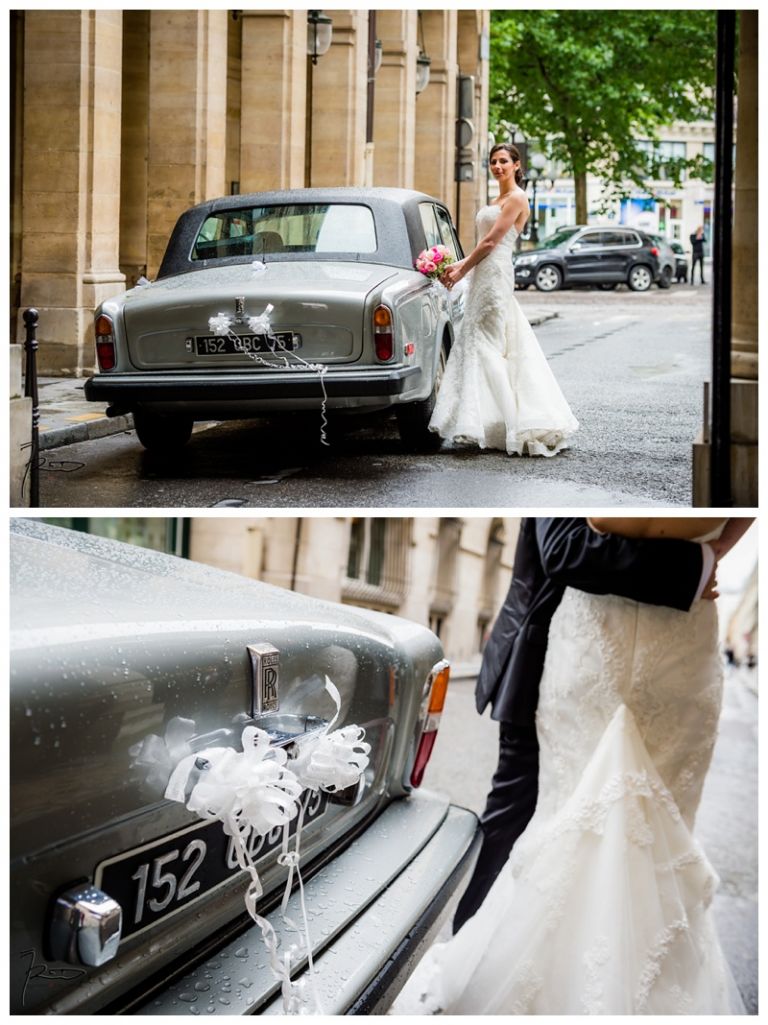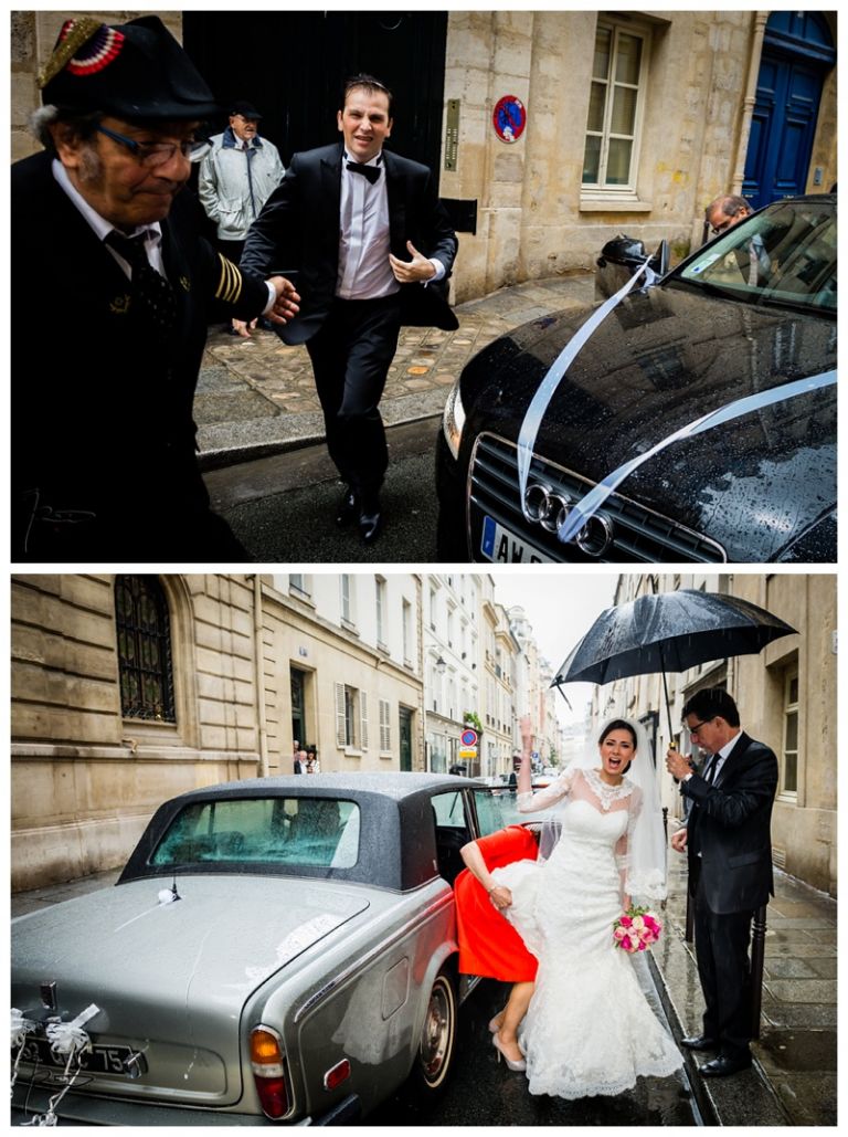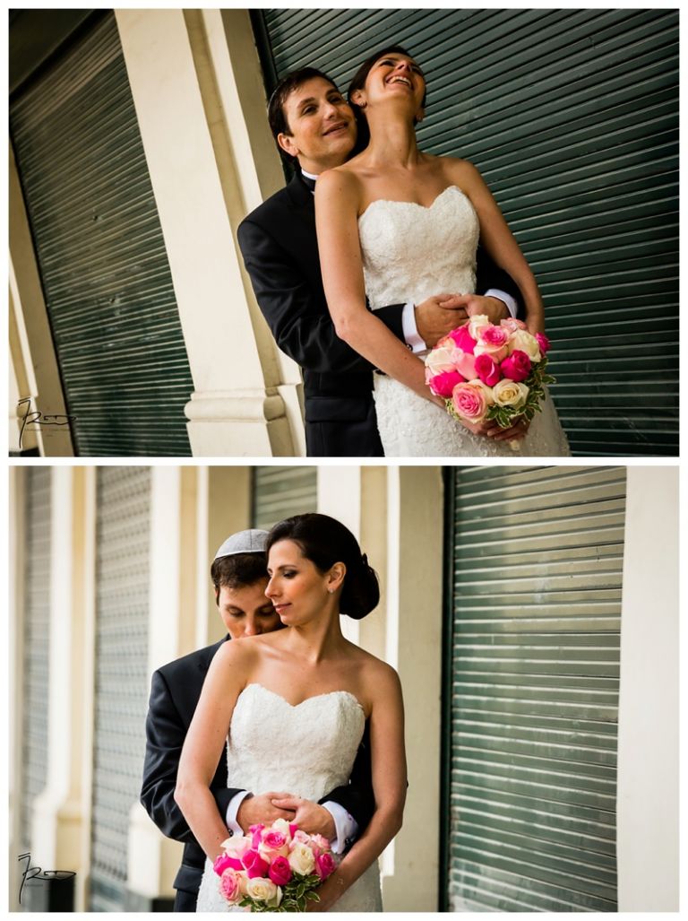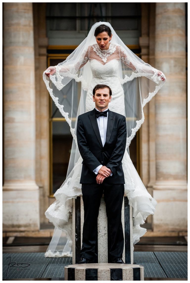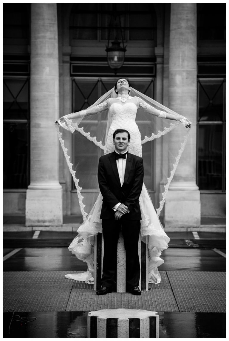 Nous avions déjà réalisé plusieurs séances photos de couple avec Barbara & Raphaël avant le jour de leur Mariage Juif religieux à la synagogue des Tournelles à Paris C’est par une séance engagement dans le quartier Juif de Paris que nous avions plus précisément pu définir les différents style photo de mariage vintage, rétro, moderne ou photo journaliste que mon couple amoureux souhaitait comme souvenirs pour leur mariage Juif – Leur mariage civil Juif à la mairie de Levallois-Perret quelques jours avant, suivi de la Soirée Henné Juif le même jour avait été un grand moment de joie pour les deux familles – Un deuxième photographe de mariage, Laurent avait suivi la préparation du marié pendant que je m’occupais de la préparation de la mariée et de toutes les filles présentes. Nous nous sommes retrouvés devant la Synagogue des Tournelles, les familles et tous les invités arrivent dans la bonne humeur et attendent avec impatience les futurs mariés sous la pluie !! Faire des photos de mariage sous la pluie est pénible, très pénible. La moindre goutte sur l’objectif est à essuyer de suite pour ne pas rater le cliché. Mes appareils sont tropicalisés ce qui veut dire que leurs joints sont de bonne qualité mais ils ne sont pas étanches non plus !! Nous ne faisons pas de la photographie de mariage sous marine !! Et c’est toujours angoissant de voir son appareil photo trempé, de peur qu’il ne fonctionne plus, même si pour ma part j’ai deux autres boîtiers disponibles immédiatement en cas de problème. Raphaël arrive sous la pluie, tout comme Barbara et nous sommes peu à y assister, les autres étant à l’abri à l’intérieur de la Synagogue des Tournelles. La bénédiction du Papa dans la salle d’à côté et Raphaël fait son entrée dans la grande allée accompagnée de sa maman sous les applaudissements jusque sous la Houpa, très ému. Barbara, prend place au début de la longue allée, la musique démarre, elle aussi très émue n’ose pas encore regarder au loin son futur époux, voulant ne pas fondre en larmes par trop d’émotion. Papa offre son bras, Barbara s’y accroche et à leur tour font leurs entrées, Laurent réalisera des coursives du premier étage de très belles images de ce défilé. L’émotion est toujours à son paroxysme quand le couple d’amoureux se retrouvent sous la Houpa. Le Rabbin, ( dont je ne connais pas le nom ), toujours le même, est d’une extrême sympathie pour tous les couples d’amoureux qui se présentent à lui. Ses cérémonies sont toujours très émouvantes, riches d’enseignements et toujours placées sous le signe de la bonne humeur et du rire. Ce n’est pas un homme austère, bien au contraire !! Entres rires, larmes et recueillements, la cérémonie de ce mariage Juif est ponctué par les Shebra Brahot, Barbara refermera son index sur l’alliance que lui présente Raphaël, ketouba signée et offerte à Barbara, bénédictions du Rabbin et verre brisé achèveront ce très émouvant mariage Juif à la Synagogue des Tournelles. Quelques photo de couple à Palais Royal, où nous attendons notre tour car d’autres photographes de mariage y étaient avant nous. Nous n’y restons pas longtemps, le soleil étant absent de ce rendez vous, nous décidons de nous retrouver à Enghien les bains, lieu du cocktail et de la Simha dans l’espoir de continuer cette séance de photos de couple si le temps le permettait.