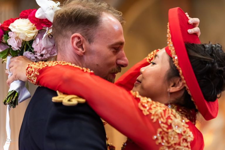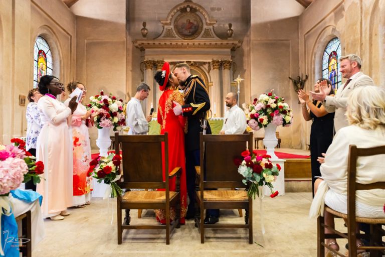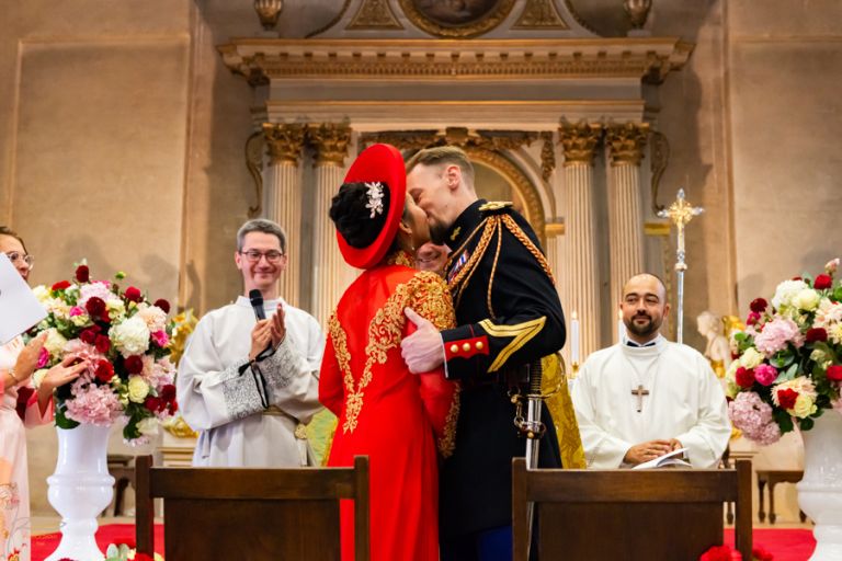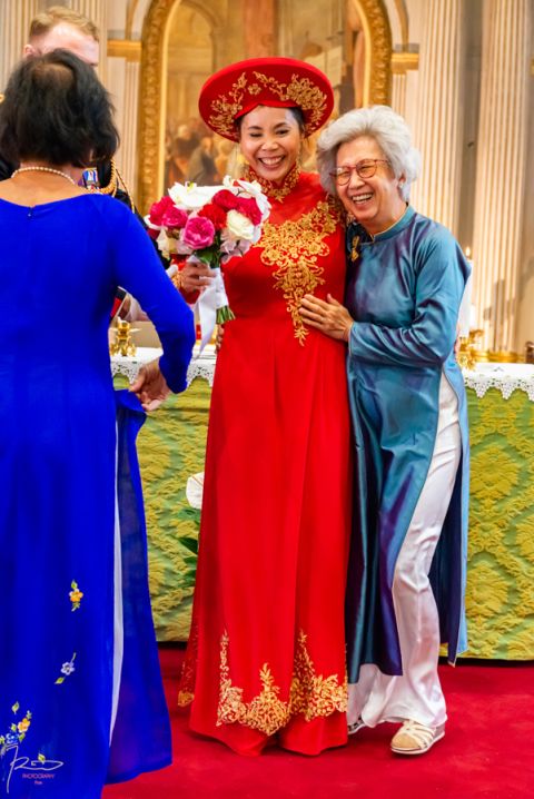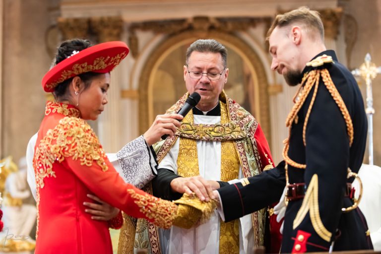 Heureux sont les photographe à shooter dans cette paroisse administrée par un Curé souriant, agréable, faisant ressentir la joie d’unir deux personnes et laissant le photographe de ce mariage vietnamien aller et venir sans lui faire de remarque comme c’est trop souvent le cas dans d’autres églises où la messe est si souvent ennuyeuse et triste. Bravo à ce Curé !